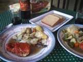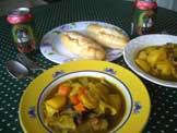 カレー風味の野菜スープ、パン、ビール