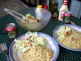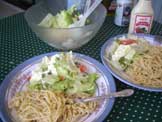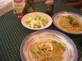 野菜スパゲッティー、サラダ、ビール