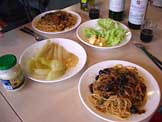 トマトスパゲッティー、赤ワイン |