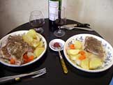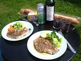 ポークスソテー、塩茹で野菜、ビール、赤ワイン