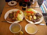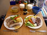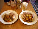 ポークソテー、ソーセージ、レタス、塩茹で野菜、スープ、ビール |