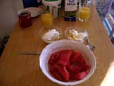ヨーグルト、スイカ、オレンジジュース、牛乳、コーヒー、紅茶 |