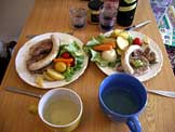 ポークソテー、ソーセージ、レタス、塩茹で野菜、スープ |