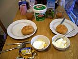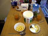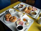 カイザーゼンメル、マーガリン、ジャム2種、ハム2種、チーズ、ゆで卵、コーヒー、スープ、牛乳、ミュースリとヨーグルト