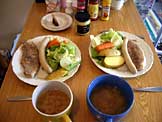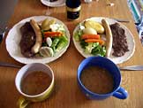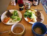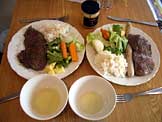 ステーキ、ソーセージ、塩茹で野菜、レタス、スープ |