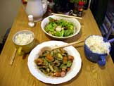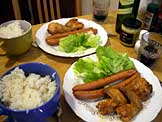 チキン焼き、ソーセージ、レタス、ご飯 |