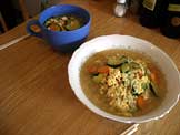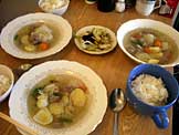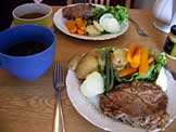 ポークステーキ、塩茹で野菜、レタス、スープ |