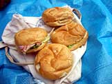 ハム・チーズ・レタスサンド、オムレツ・レタスサンド、水
