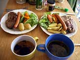 ポークソテー、ソーセージ、塩茹で野菜、レタス、スープ |