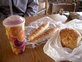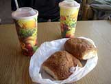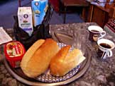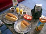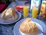 オレンジ5個とざくろ2.5個分の生ジュース1つ、パン2つ、頂き物のパン2つ