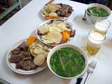 牛ステーキ、塩茹で野菜、ほうれん草と野菜のスープ、ビール