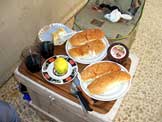 ホブス、ゆで卵、トマト、オリーブ2種、アプリコットジャム、ドライナツメ