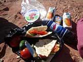ピタパン、トマト、キュウリ、チーズ、ペプシ、オレンジジュース、スウィーツ