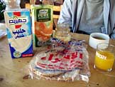 アエーシ(エジプトの平たい袋状のパン)、アプリコットジャム、牛乳、オレンジジュース、コーヒー |