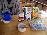 普通のパン、ヘーゼルナッツチョコクリーム、牛乳、オレンジジュース、コーヒー |
