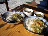 野菜炒め丼、モロヘイヤのスープ