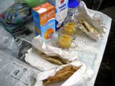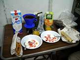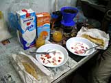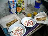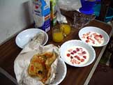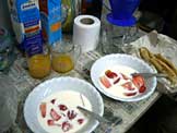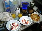 イチゴミルク、砂糖巻きパン2枚、オレンジジュース、牛乳 |