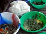 ほうれん草の煮物2種、ウガリ、小魚、鶏の腸の炭焼き
