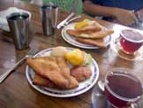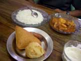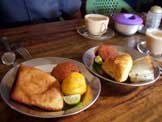 マンダジ、豆のコロッケ、チリはさみポテト揚げ、ゆで卵、紅茶