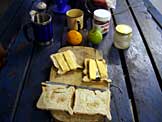 食パン、目玉焼き、チーズ、ピーナツバター、オレンジ |