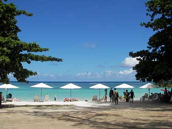 門のように両脇に樹木が繁り、白いパラソルの向こうには夢のような碧いグラデーションの海と空。楽しい休暇の始まりを告げるようなこの導入に、ビーチに向かう度に心が弾んだ。