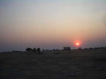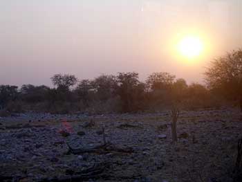 6時半に車でキャンプ場のゲートを出ると、煙ったように霞む東の空にアフリカ特有の燃えるような大きくて真っ赤な太陽が上がり始めていた。