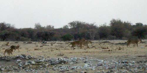 走り始めて5分しか経っていない時、非常に遠くにだがライオンの親子が歩いているのが認められた。今日の一発目はライオンだ!