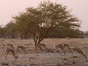 強烈な朝日の光に照らされて、周囲がオレンジ色に染まる中で、次に見かけたのはスプリングボック。