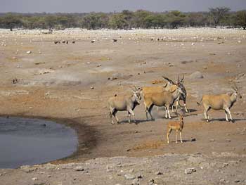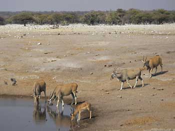 9時42分にウォーターホールに到着。エトーシャには64個のウォーターホールがあるそうだ。そのうち、天然が半数で残りは自然保護のために人工的に作られたものだそうだ。この時停車したのは、天然のウォーターホールだ。停車した時点では、シマウマ1頭とイランドというオスは角4本、メスは角2本の草食動物が2頭しかいなかった。