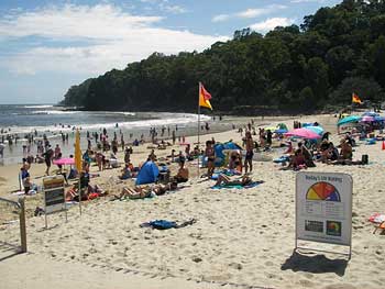 メインビーチまではインフォメーションから3分とかからない。浜に出てみると右側がこんもりした緑で行き止まり、左側には長く続くビーチになっていて、なによりも朝9時を過ぎたばかりだというのに、何じゃこりゃー!という人の数。正月休みでもないし、イースターまではまだ日があるはずだし、一体何休み?とにかく朝っぱらから元気にビーチライフを楽しむ人々がたくさんいるのに、まず驚いたのだった。