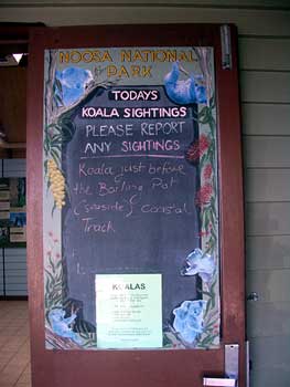 メインビーチからボードウォークなどをぶらぶらと歩くこと15分。国立公園の入り口に到着する。入場は無料のようだ。公園の管理事務所とインフォメーションを兼ねた建物の入り口には、「今日のコアラ目撃情報」という掲示板があって目撃した人がここに書き込むようになっている。さぁ、見られるかな?