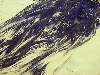 地図によればこの海岸線のどこかから山中に戻れるはず。ビーチ沿いをブラブラと歩いて行くと、中ほどは川が流れ込んで水が茶色くなっていて更にプランクトンの一種が繁殖する時期なのだろうか、白い泡がブクブクとたってとても入りたくない状況だったが、この辺りは川から流れ出す成分に蹉跌のような黒い粒子があり、それが地のベージュの砂に混じってとても美しい模様を作り出していた。
