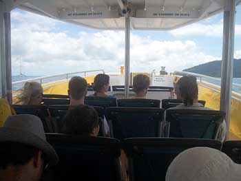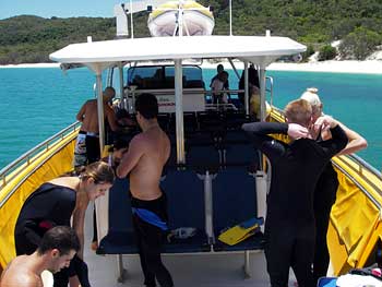 さて、出発当日は朝9時30分に宿から徒歩5分くらいの場所でピックアップされることになっていた。やがてお迎えの車がやってきて、フェリー乗り場に移動。フェリー乗り場でボートに乗る前に、スティンガースーツを借りるかどうかを聞かれた。この時期は海にくらげが大量に発生しているので、全身を覆うスーツを着てくらげに刺されないようにするのだそうだ。これは別途レンタル料金が必要で、ええっとぉ、詳しい金額が記憶から抜けてしまって、確かA$5とかA$7とかそんな金額だったと思う。