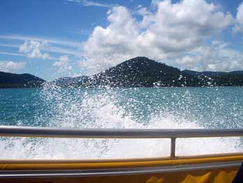 ところが、スピードボートが猛烈にエンジンを回転させて走り出し、いよいよホィットサンデー諸島の緑の山々が見える辺りにさしかかり、周囲の海の色が光の加減で得も言われぬコバルトブルーに光りだすと、スペイン人のグループは立ち上がる、ポーズを取る、写真を撮るってな具合に好き勝手にやり始め、船長にマイクで「危険ですので立ち上がらないように」と何度も注意される羽目に。