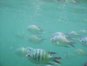 浜辺近くの浅い所には人がいなくなると透明な魚がスーッと群れでやってくる。岸近くの水中に静かに座っていると、人がいなくなったと思って魚がスーッと横切ったりするのを眺めれらるのだ。