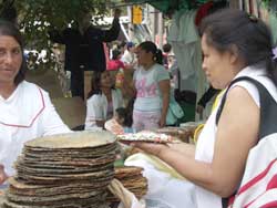 今日、初めて見た屋台はこれ。黒っぽい青緑色の薄いトルティーヤに、ウチワサボテンの細切りと粗みじん切りの玉ねぎとトマトとコリアンダーを混ぜたものを乗せ、サルサを振りかけ、粉状のチーズを振りかける。トルティーヤは食せるカビのついたとうもろこしで作っているとある人から聞いた。メキシコ版ピザといったところか。名前はわかならいが、かなりボリュームのあるスナックだ。