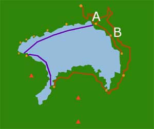 片側1車線の舗装された道路は、ピックアップも頻繁に通る。何度か挫折して手を上げそうになったが、だんだんと湖が姿あらわす光景を、車で通り過ぎるのはあまりに惜しいと、頑張って歩くことにした。S字のカーブをいくつも登って、やがて湖がグワーッと見える所まで登ってきた。いやー、いい眺め。汗が噴出した額を拭って、湖を渡る風を全身で受けて深呼吸。日ごろの運動不足を解消した満足感に、この風景。ほんと、来てよかった。