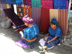サンタ・カタリーナ・パロポの湖に面した側を下とすると、我々は左側から村に入ることになる。村に入って100mほど道に沿ってまっすぐ歩くと、左手に教会が見える。その先の道を右に折れると、湖に続く道となる。お目当ての温泉は、湖まで出たら、右に300m歩いた所にあるらしい。湖付近になると、大きなホテルがあり、その付近には、布を織る実演をしながら、民芸品を売る実演販売の露店がいくつも出ていた。こうして、実演されると、またグッと心が惹かれてしまう。あんまり覗いていると、本当に欲しくなってしまいそうなので、ほどほどにして、先に進んだ。
