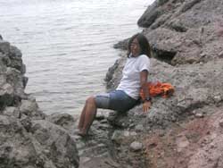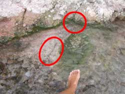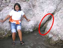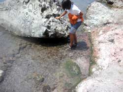 というわけで、この理想的な場所は通り過ぎ、更に進むと、水面からうっすら湯気が上がっているところが見えた。ここは、まったく石などに囲われておらず(いや、多少囲おうとした形跡はあるが、途中で挫折したようだ)、岩の裂け目から、ユラユラと湯が出ているのが見えた。足をつけたとたん、「あちっ!」。かなり熱い湯だった。まわりの水を足で蹴って、冷たい水を入れながら、裂け目付近の温度を調節して、足をつけることができた。ずーっと足を動かしていないと、すぐに熱くなってくるので忙しいが、グアテマラに来て、初めて出合った熱い温泉。ジーンズを膝までまくり上げて、お互いに気に入った場所を見つけて、足湯の体制に入った。