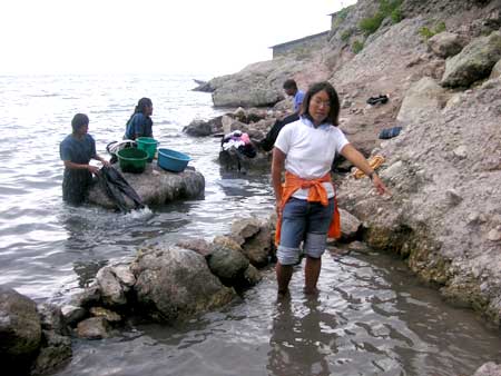 やがて野原も終わり、湖に少し突き出した岩肌のところに来ると、現地の女性が湖の水で選択している姿が見られた。「近い!」。