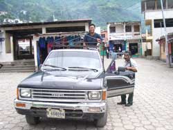 教会前でピックアップを待つ。「パァナ? パァナパナ?(パナハッチェル行きだよ、乗ってかないかい?)」と呼びかけるピックアップの運転手に、「乗る、乗る」と手を上げて停まってもらった。