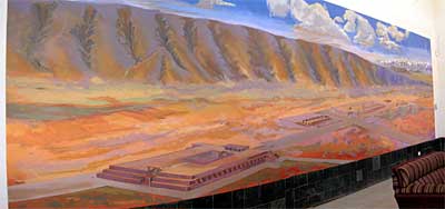 次は隣に併設してある考古学博物館に案内された。右写真はロビーにある遺跡の全体図である。遺跡全体はこのような形をしているようだが、この後行ってみるとピラミッド部分は現在発掘中でこのような形は見ることはできなかった。考古学博物館内には、石組みをつなぎ合わせるために、石の継ぎ目に金属を流し込んで止められる溝が彫ってあり、ここに溶かした金属を流し込んで固定していくパネル展示と実際の金属片の分析結果が展示してあった。ティワナクという文明はインカ文明に直結する文明で、このあたりはインカの石組みに繋がる技術のようであった。