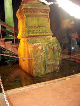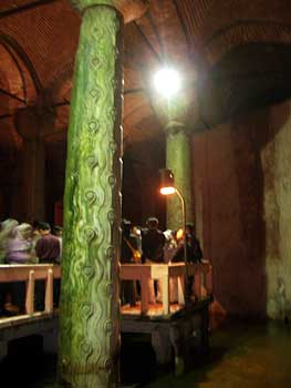 イスタンブールの旧市街にいくつかあるという地下貯水池の中でも、この地下宮殿と呼ばれる所は4世紀から6世紀に造られたといわれているそうだ。ビザンツからオスマントルコ朝時代にかけて、周辺地域の水源となっていたというわけ。入場料金がTRY10(=US$6.77)ということもあり、バックパッカー達には今一つ人気がない観光スポットなのだが、ガイドブックの妖艶な柱が並ぶ写真、横向きになったメドゥーサの首の彫刻を見て、私は俄然行きたくなった。