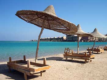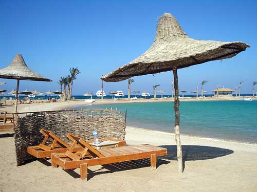 パブリックビーチは最初だだっ広い海岸が続いているが、やがて小さな湾を取り囲むようにパラソルとビーチベッドなどが並ぶ所になる。ここでビーチベッド(EGP5=US$0.84)か、リクライニングしない椅子(EGP3