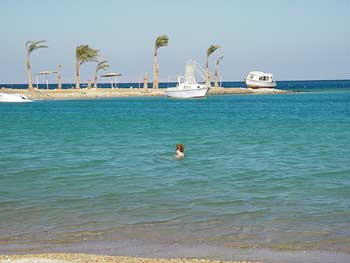 メインロードに戻って再び進む。左手には大型のホテルがいくつか見えてきて、その先の海岸沿いが公園のように何もない空間になっていた。この空間の部分がパブリックビーチらしく、囲いの端にある入り口で入場料金を徴収された(一人EGP3.5=US$0.59)。パブリックビーチに至る手前のホテルとホテルの間には、どちらの敷地にも属さない海辺があり、ここなら入場料金を支払わずに入ることも可能だろう。サーラ・ダイバーズの情報ノートには、無料のビーチ情報として掲載されていたが、しょぼい、しょぼすぎる。ホテルとホテルの間の敷地は汚らしく、ちっとも気持ちが良くなれない雰囲気だった。それよりはわずかな入場料金を支払ってもパブリックビーチに入った方が整備されていてよっぽども気分がいいと思う。
