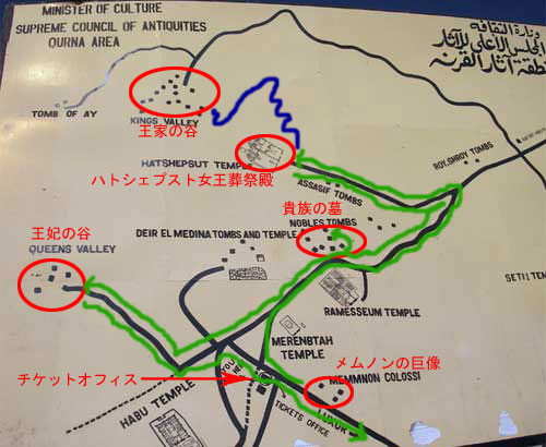 私たちは慎重に見所を考えて、午前中に王家の谷、ハトシェプスト女王葬祭殿、貴族の墓、午後から王妃の谷を見てまわり、時間があったらラメセス3世葬祭殿を見ることにして必要なチケットを購入した。貴族の墓は、何人かの貴族の墓の組み合わせチケットを買うようになっていた。どの組み合わせがいいのかよくわからないが、ガイドブックを見て墓の内部に宴会の図と徴税の図が描かれているという、ナクトとミンナの墓を選んだ。