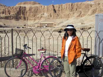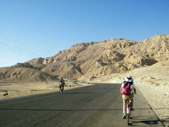チケット販売小屋のあるT字路から右折して、まずは一路ハトシェプスト女王葬祭殿をめざす。ここに自転車をとめて、右手の山を徒歩で越えて山の向うの王家の谷が第一の観光ポイント。山を登っていかなきゃならないので、朝の暑くなる前に一仕事してしまおうというのがミソだ。
