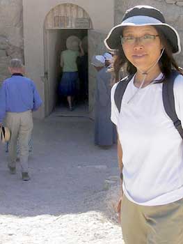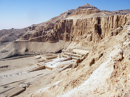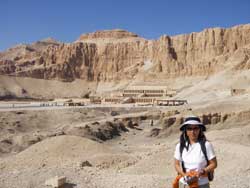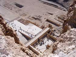 途中かなりきつい斜度になる部分もあるが、10分も上り続けるとハトシェプストを上から眺められる所に出る。大きな岩に抱かれる様に葬祭殿が建てられていて、女性ながらもファラオとなった人の偉大だった姿が偲ばれる。この景色を見ると、ここまで上ってきた苦労が報われる気がした。
