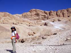ここから数分歩くと、今度は右手の眼の下に王家の谷が見えてくる。20分も歩くと、王家の谷に降りていけそうな細い道が幾筋か通った斜面を見つけることができた。この辺りまでくると、バクシーシ狙いのおやじたちが道案内をしようと、カンダダのごとく下から上がってくる。おやじたちをかわしながら、ヒョイヒョイと降りていかねばならなかった。