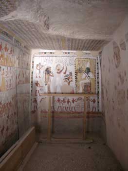 入ろうとすると、中からエジプト青年がのっそり出てきて「はい、チケット見せて」と言うのだった。こんな所に一日中はりついて、来るかどうかもわからない客待ちをするもぎりの仕事は辛そうだった。中は博物館のように、ショーケースがあったり、解説パネルが立っていたりして、こんな寂れた村の中に埋もれるようにある墓にしては、しっかりと整備されている。のっそりした青年は、私たちにくっついて周り、何かを説明しようと狙ってくるのでゆっくりと見ることもままならなかった。墓内はそんなに広いわけじゃない。5分くらいでくるーっと見て周ると、余計な説明をされないように、次の墓の場所だけ聞いてサーっと走り去った。そうなのだ、1つ目の墓さえ見つけられれば、後は墓守(というか学芸員)に次の墓は教えてもらえるので、1つ目を探すことだけを頑張ればいい。